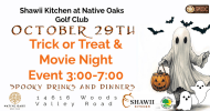Join us at Shawii Kitchen & Native Oaks Golf Club for a frighteningly fun Trick, Treat & Movie Night! Spine-chilling cocktails & mocktails, Spooktacular dinner menu Halloween movie magic under the stars and treats galore for all ghouls and goblins! ...
