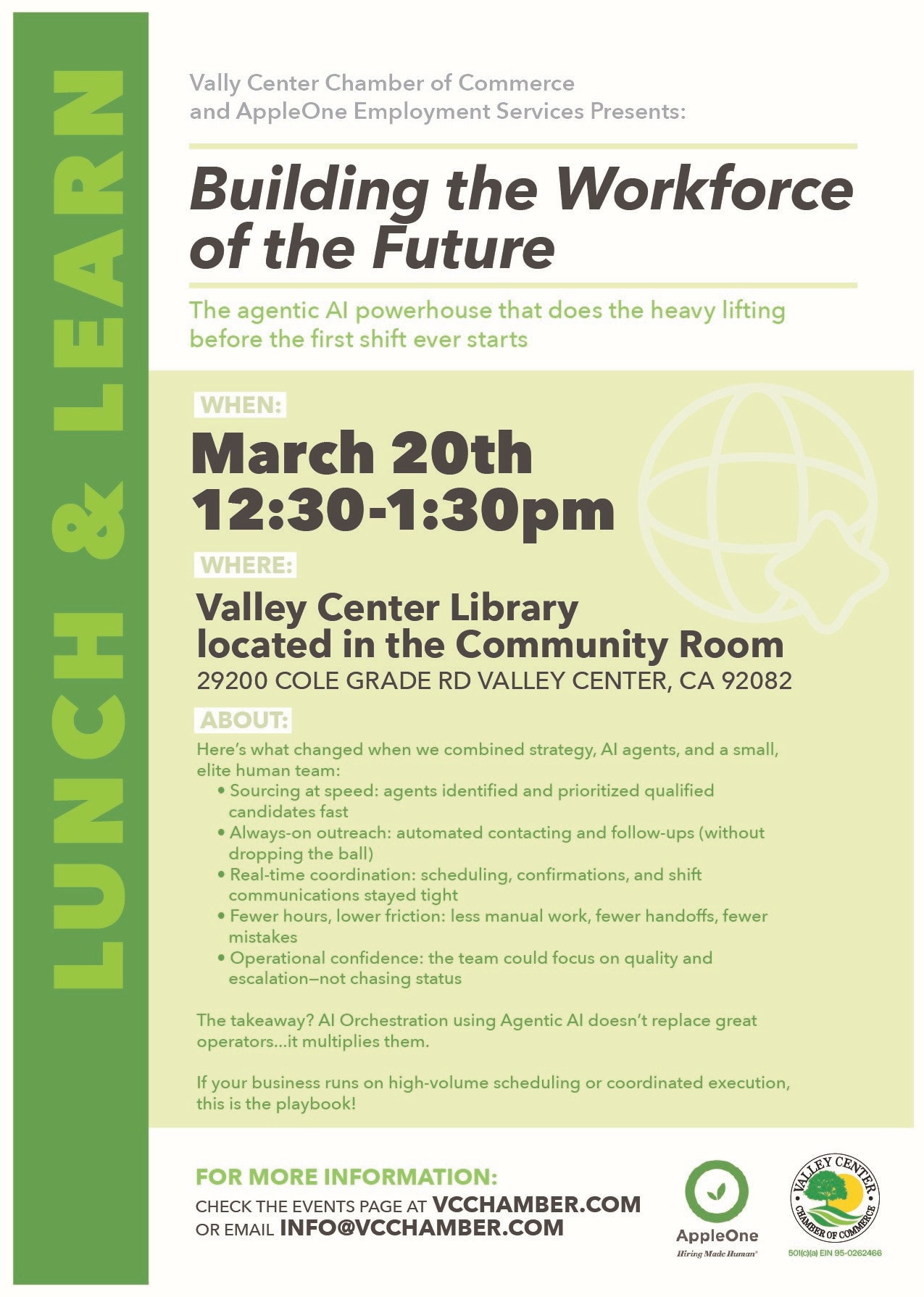 Come enjoy our FREE quarterly Lunch & Learn with the Vally Center Chamber of Commerce and AppleOne Employment Services Presents: Building the Workforce of the Future.